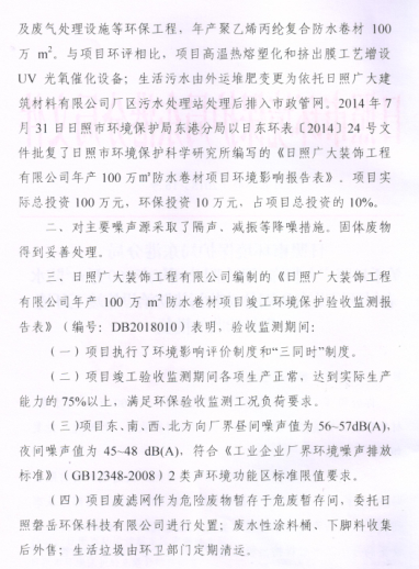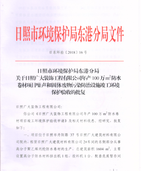 關(guān)于日照廣大裝飾工程有限公司年產(chǎn)100 萬(wàn) m2 防水卷材項(xiàng)目噪聲和固體廢物污染防治設(shè)施竣工環(huán)境保護(hù)驗(yàn)收的批復(fù)