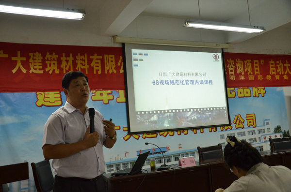 2015年7月14日,日照廣大建筑材料有限公司“6S規(guī)范化管理咨詢項(xiàng)目”啟動(dòng)大會(huì)在研發(fā)中心大會(huì)議室隆重召開(kāi),公司董事長(zhǎng)程永聚、副總經(jīng)理劉偉、許繡梅以及公司全體管理人員和各部門(mén)業(yè)務(wù)骨干近60人列席參會(huì)。項(xiàng)目啟動(dòng)大會(huì)由辦公室主任王麗萍主持,明洋公司咨詢總監(jiān)王潤(rùn)老師對(duì)廣大建材目前在企業(yè)管理方面尤其是生產(chǎn)管理方面存在的問(wèn)題進(jìn)行簡(jiǎn)單介紹,同時(shí)對(duì)此項(xiàng)目的咨詢內(nèi)容、推進(jìn)步驟、咨詢目標(biāo)、項(xiàng)目推進(jìn)計(jì)劃等做了詳細(xì)講解。